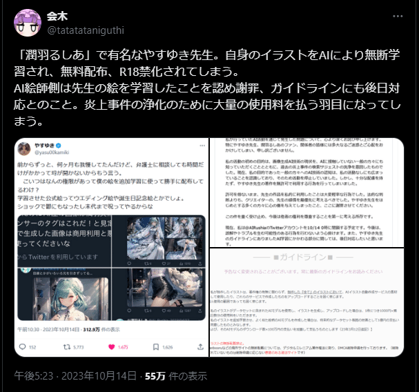 2023/10/14、反AI絵師の「やすゆき」氏が、かつてデザインを担当したVTuber「潤羽るしあ」のLoRA制作者の1人「AI潤羽るしあ(@AI_Rushia)」をTwitter上で晒し上げ、約41.1万人のフォロワーを使ってファンネル攻撃を実行。