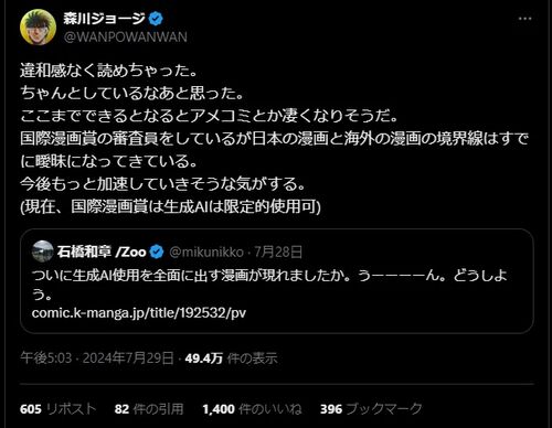 2024/7/29、「はじめの一歩」等で知られる著名なマンガ家の森川ジョージ氏が、Twitterにおいて、画像生成AIを使用したマンガ作品「児童福祉司 一貫田逸子 リメイク版」に肯定的な態度を示したところ、「クリエイターのくせに生成AIを肯定している」として反A…