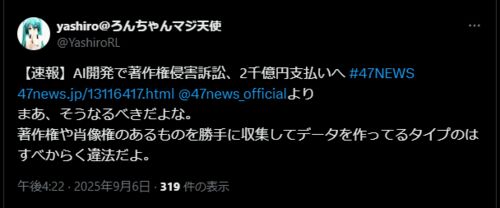 2025年9月6日、2024年8月から行われていた、Claudeで著名なAI企業Anthropic社に対する無断学習罪関連の集団訴訟において、Anthropic社が約15億ドル(約2200億円)の和解金を提示。おそらくこのまま和解するとみられる。 publishers.org 一見するとAnthropic社…