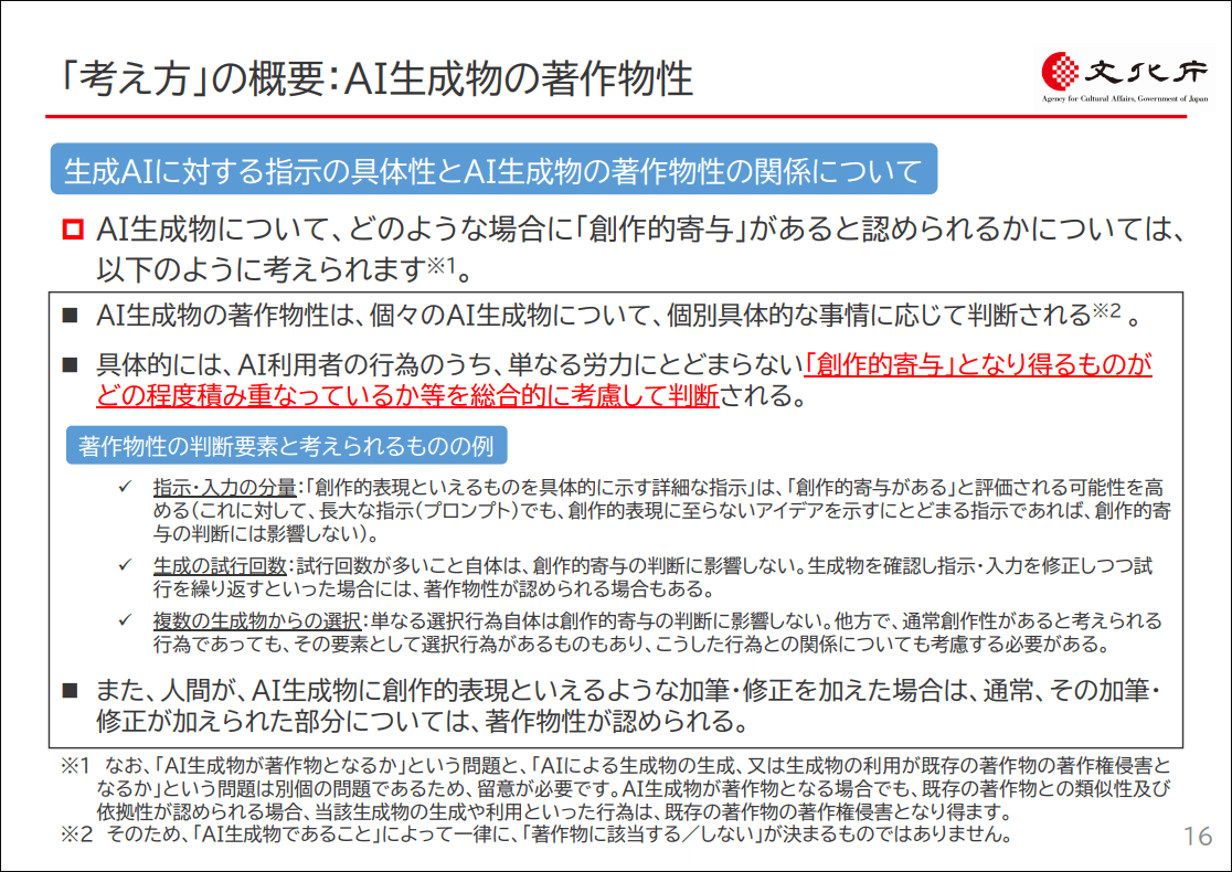 文化庁は3年前の時点で、「ポン出しは例外中の例外として、プロンプト調整・チェリーピック・加筆・修正等の工程が入れば、AIを使用しても著作権は発生し得る」という見解を示していた。しかし反AIはそれを無視して、3年間ずっと「AIを使った画像は著作権が発生しないので無断転載し放題」というデマを流してきた。それが可能だったのは、文化庁の見解が理論だけで、実際の事件や判例が存在しなかったからだが、今回「事件」が発生した事で、「AIアシストを受けても著作権は発生し得る」という文化庁の見解は、理論だけでなく警察の実務上の取り扱いも含むようになった。これは判例ではないので、反AIは引き続き文化庁の見解を無視し続けると思われるが、デマを取り巻く状況は大幅に悪化している。