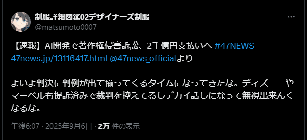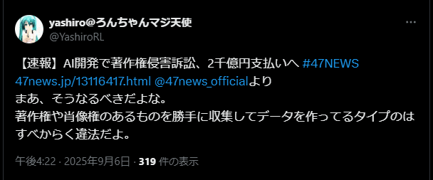 2025年9月6日、2024年8月から行われていた、Claudeで著名なAI企業Anthropic社に対する無断学習罪関連の集団訴訟において、Anthropic社が約15億ドル(約2200億円)の和解金を提示。おそらくこのまま和解するとみられる。