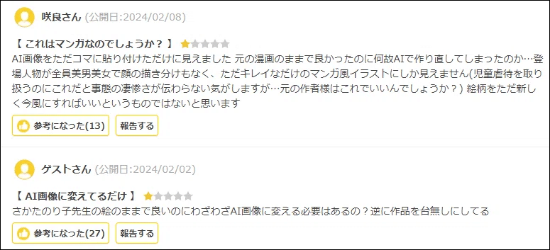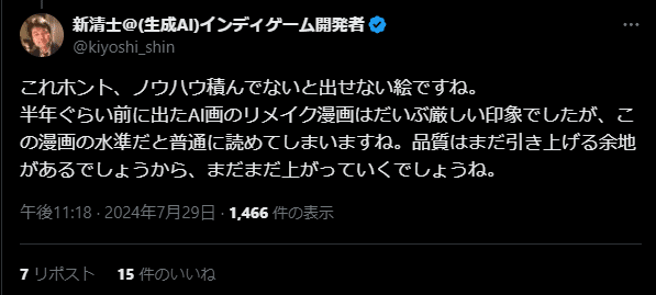 毎度反AIにキャンセルされている投げっぱなし自治体ポスターもかくやというレベルの低さである。森川ジョージや新清士がどこを見て良いと言っているのか全く分からない。むしろ反AIが「あまりにもレベルが低いので安心しました」と言い出す方が話としてはまだ分かる(こんな出来の悪いものを見て安心されても困るのだが)。