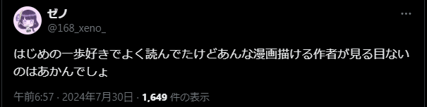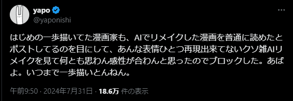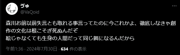 2024/7/29、「はじめの一歩」等で知られる著名なマンガ家の森川ジョージ氏が、Twitterにおいて、画像生成AIを使用したマンガ作品「児童福祉司 一貫田逸子 リメイク版」に肯定的な態度を示したところ、「クリエイターのくせに生成AIを肯定している」として反AIが群がり、焼かれる。