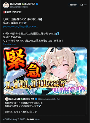 2025年8月2日、ホロライブ所属のVTuber「風真いろは」が、「1,111,111登録者見届け歌枠」をTwitterで告知。