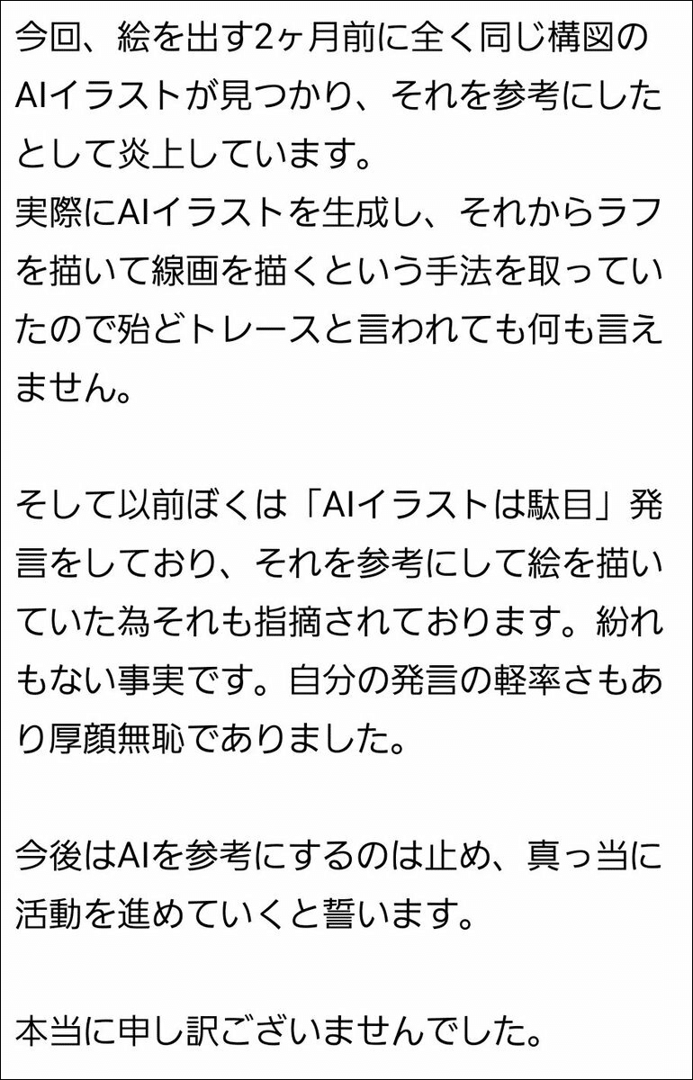 「刻印ふれーず。」は同日17:39に謝罪文を掲載。しかし、本件は「他人が作ったAIイラストを手描きで盗作した」事が問題とされているのだが、謝罪文では他人の絵を盗んだ事実を認めず、「自作のAIイラストから線画を起こして作画した」「反AI発言をしながらAIを使ってしまい申し訳ありませんでした」と本件と全く関係ない事に対して謝罪しており、不誠実で意味不明なものになっている。