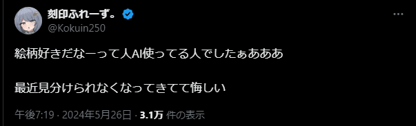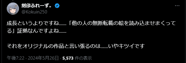 ここまで完全にAIイラストをパクりながら、「刻印ふれーず。」が反AIなのも間違いないようで、直近で5月にも下記のような発言をしている。