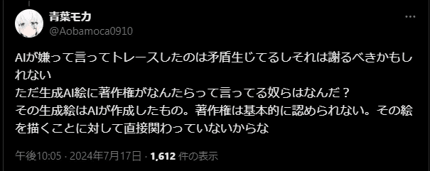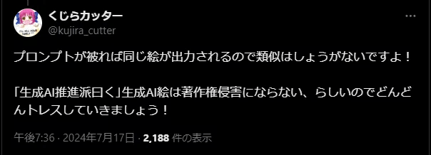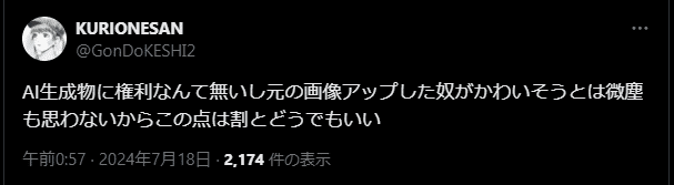 21万のフォロワーは擁護を試みたが、「盗作した」という事実を変えられないため、エクストリーム擁護実行にあたって、「AIイラストには著作権が無いので盗作してもセーフ」という、Gen-AI誕生当時から存在する古典的なデマが久しぶりに復活した。