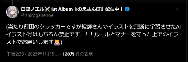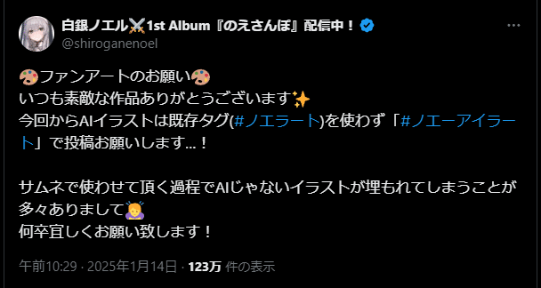 2025年1月14日、ホロライブ所属のVTuber「白銀(しろがね)ノエル」が、既存のイラスト用タグ「#ノエラート」とは別に、AIイラスト用のタグ「#ノエーアイラート」を新設すると告知。