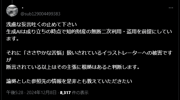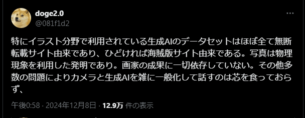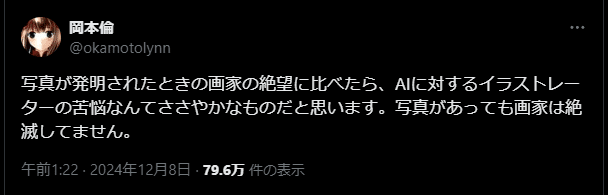 2024年12月8日、「エルフェンリート」等で著名なマンガ家・岡本倫氏が、Twitterに「写真が発明された時の画家の絶望に比べたら、AIに対するイラストレータの苦悩なんてささやかもの」との持論をポスト。