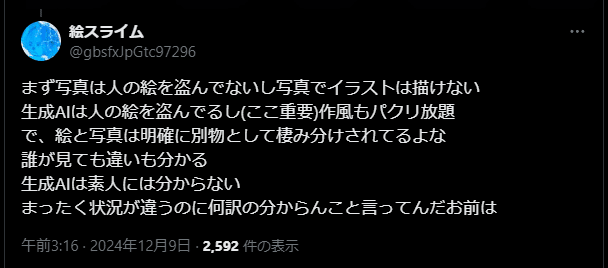 こういった話の主題は「出現してしまった苦悩と絶望をもたらす存在に対してどう適応するか」という事であって、「写真と生成AIが同じ物かどうか」という各論的な話ではないのだが、反AIの話は各論一色となった。